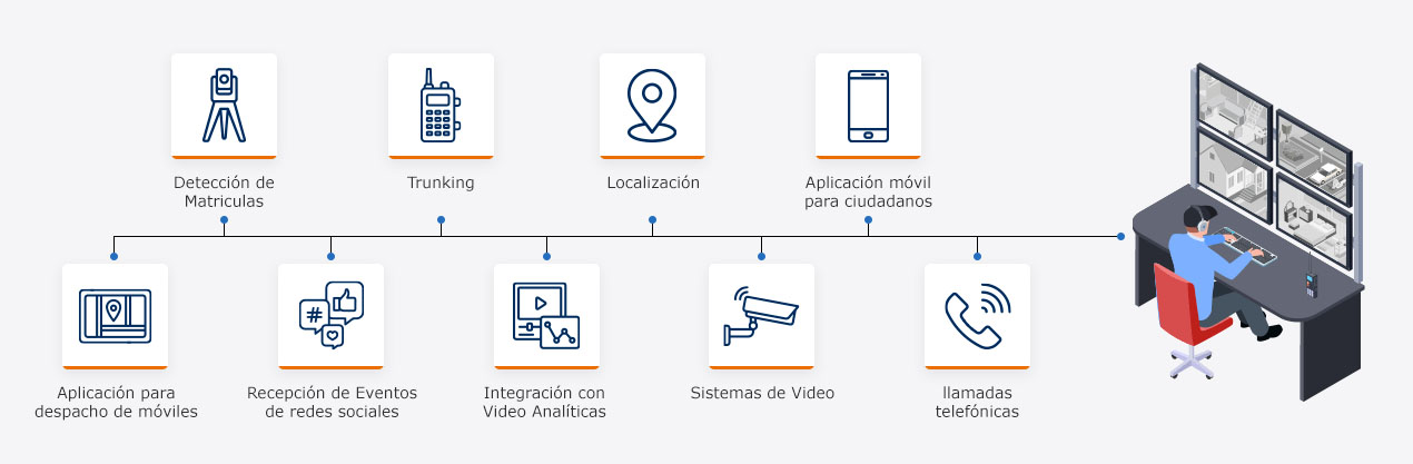 - Proporcionan una plataforma de integración a partir de la cual las ciudades pueden recopilar y analizar información de múltiples fuentes, como sistemas de video, aplicaciones móviles, botones de pánico, llamadas de emergencia y redes sociales.